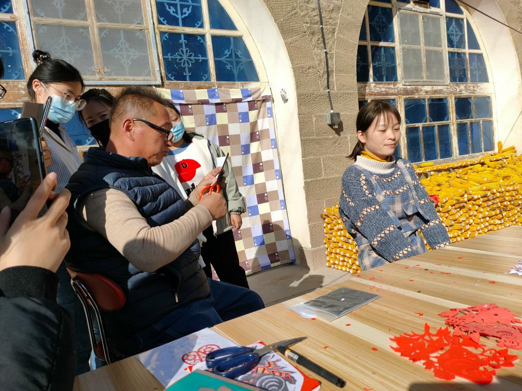 来到剪纸传承人钱凯老师家里,参观学习他剪纸艺术的魅力。钱老师家里布满了各种各样的剪纸作品,有可爱的小动物造型、逼真的人物画像、特色的陕北话等,画面形象,手法精细,物象生动,为他剪纸艺术工艺的精湛而叫绝。在钱老师的指导下我们一起动手亲身体验剪纸工艺的精细的技法与乐趣,这更加深了我们对剪纸工艺的认识与理解。