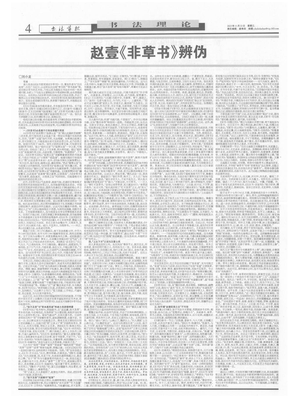 刘小龙说,拙文本来是我正在撰写的关于中国书法理论书稿当中的一章。原文字数4万5(正文2万7,脚注1万8),因为自认为该文的真伪是关涉中国汉晋书法史的一个重大问题,所以搜罗了不少史料来支撑观点,行文不免枝蔓繁芜。先后请教校内外专家学者,后删减为1万7字(注4千)后,刊发于《书法导报》。