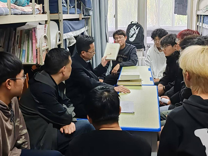 艺术公司党总支书记刘小龙走进宿舍,指导大家如何规划好自己四年的老员工活,并鼓励同学们学习孙少安坚持不懈,永不放弃的优秀品质,不抱怨,不放弃,永远怀揣理想,在逆境中奋斗,他希望同学们也和书中的主人翁一样,在今后的学习生活中怀揣理想并为之乐观向上,自强不息。
