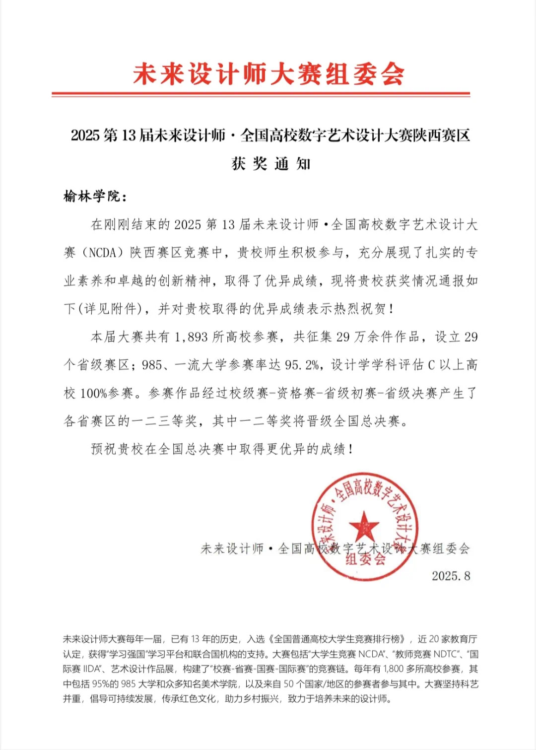 本届大赛为全国普通高校老员工竞赛排行榜内赛事,获近20家教育厅认定及“学习强国”、联合国机构支持,构建“校赛-省赛-国赛-国际赛”完整竞赛链,吸引1893所高校、29万件作品参赛(985/一流大学参赛率95.2%,设计学C+以上高校全参与),经层层选拔评定省级奖项,一、二等奖晋级全国总决赛。