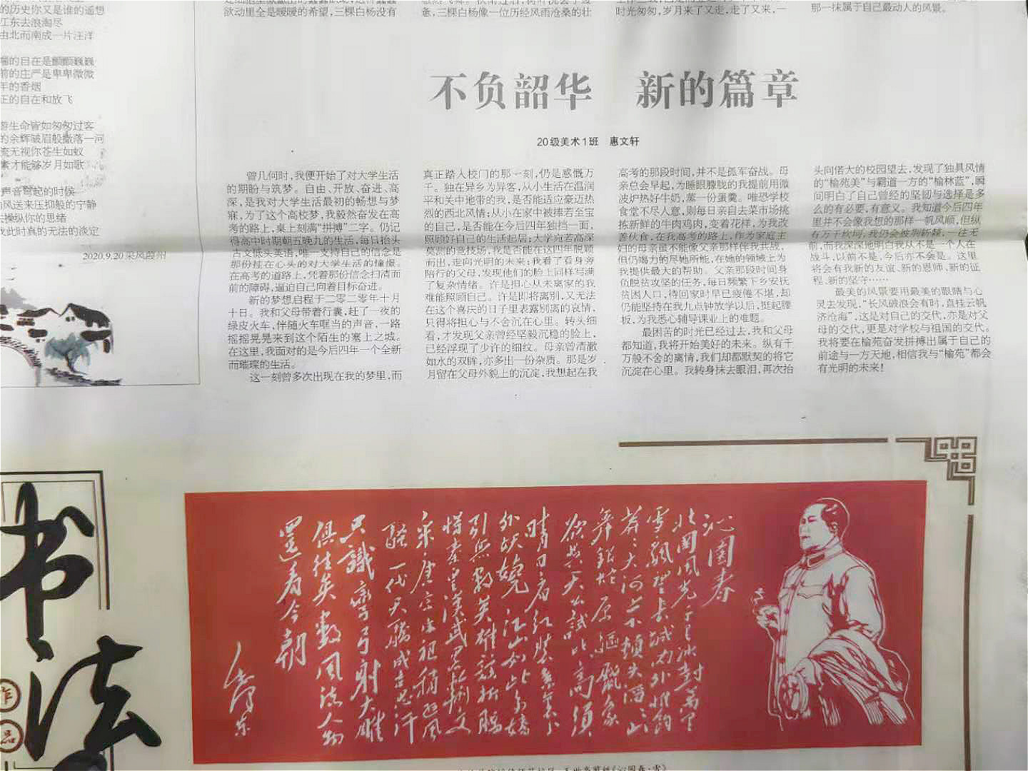 新的梦想启程于二零二零年十月十日。我和父母带着行囊,赶了一夜的绿皮火车,伴随火车哐当的声音,一路摇摇晃晃来到这个陌生的塞上之城。在这里,我面对的是今后四年一个全新而璀璨的生活。