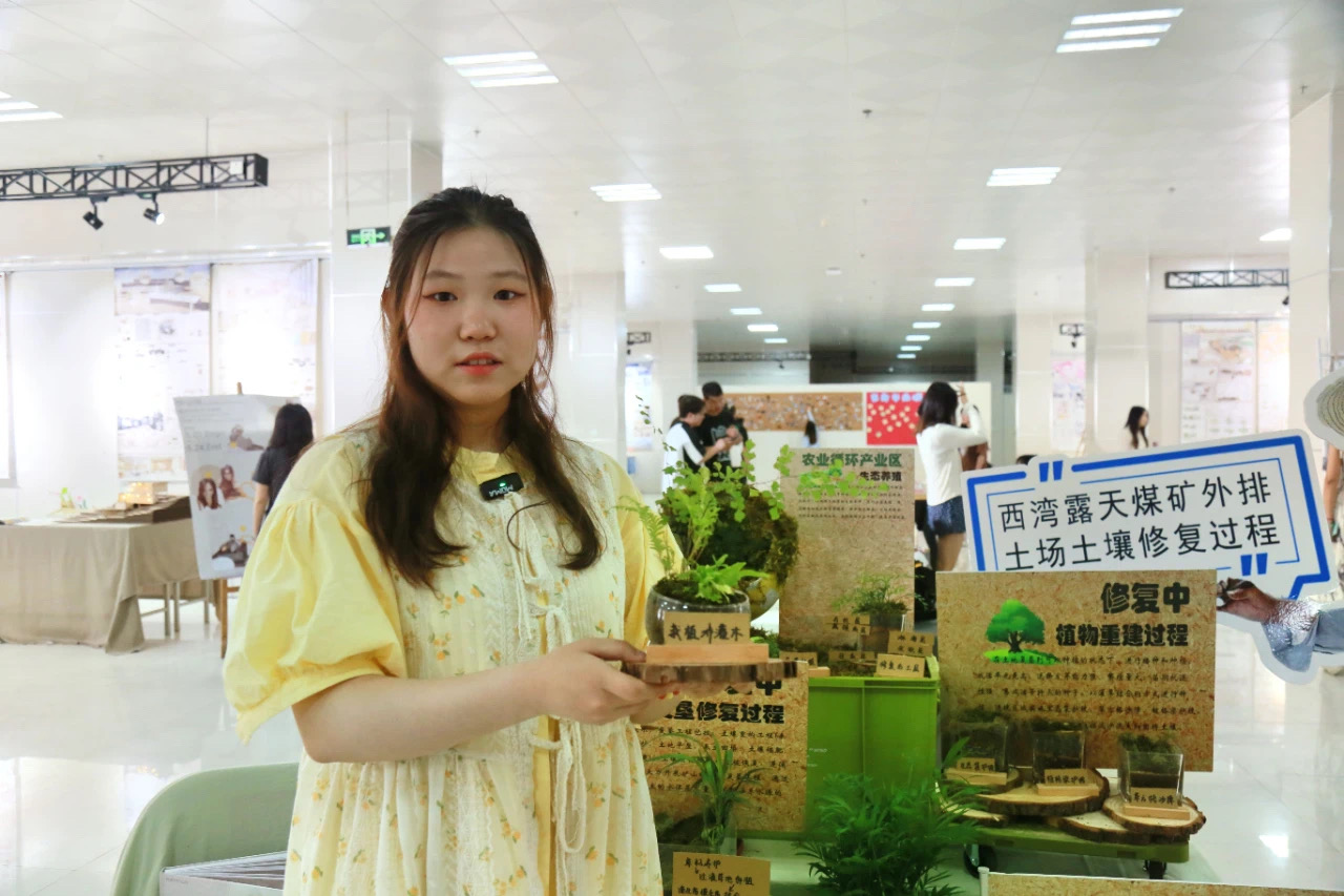 走进展厅,放置在最显眼位置的一抹绿色吸引了许多参观者,这是2024届环境设计专业毕业生赵钰宁的毕业作品《“农业循环产业园设计”—基于 NBS 理念的榆林市西湾煤矿生态修复计划》,这件作品同样也获得了此次毕业设计的第一名。