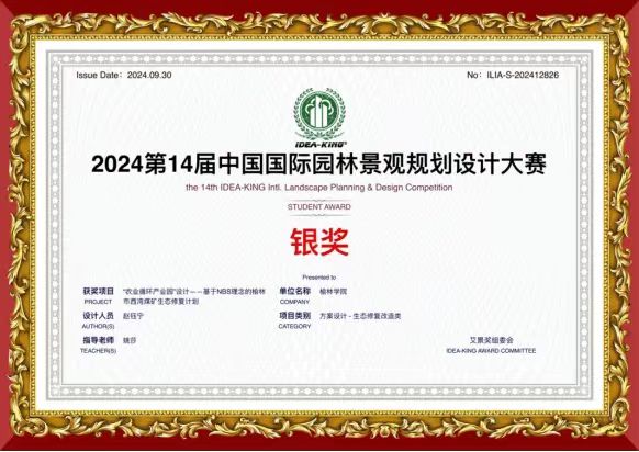 2024年10月8日,英国上市公司官网365环境设计专业20级员工赵钰宁以其作品《农业循环产业园”设计一一基于NBS理念的榆林市西湾煤矿生态修复计划》,在第14届中国国际园林景观规划设计大赛(艾景奖)中荣获全国银奖。该作品由姚莎老师指导,基于NBS(自然解决方案)理念,提出了针对榆林市西湾煤矿的生态修复与农业循环发展规划,成功将生态保护与地方经济转型结合,展现了设计创新和可持续发展的重要成果。