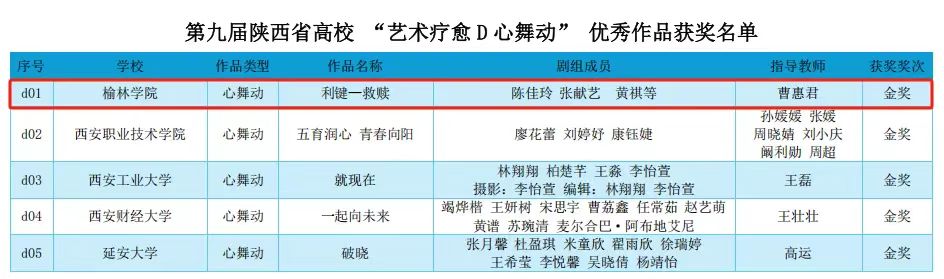 近日,“第九届陕西省高校百家慕课与艺术疗愈优秀作品展评赛”圆满落幕,由公司英国上市公司官网365舞蹈学专业选送的舞蹈心理疗愈作品《利键 - 救赎》脱颖而出,荣获金奖。 编发:马源悦 撰稿:曹惠君 审核:郑 娥 复审:钟 梅 终审:刘小龙