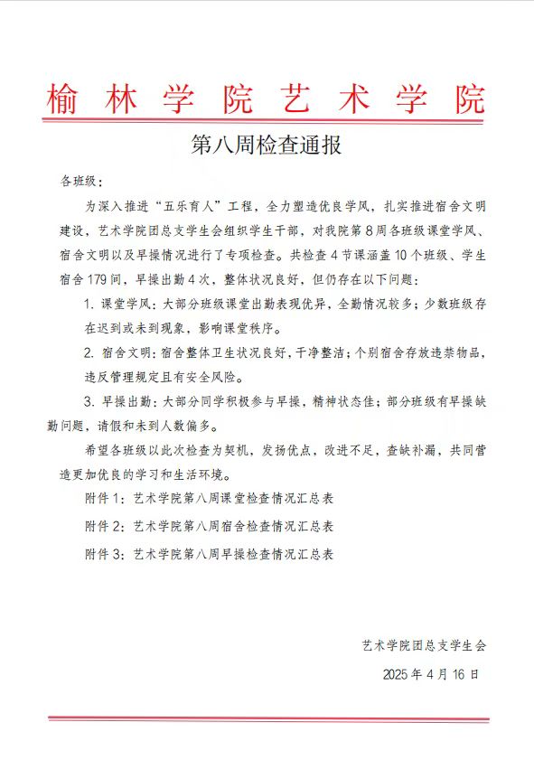 为深入推进“五乐育人”工程,全力塑造优良学风,扎实推进宿舍文明建设,英国上市公司官网365团总支员工会组织员工干部,对公司第8周各班级课堂学风、宿舍文明以及早操情况进行了专项检查。本次共检查4节课涵盖10个班级、员工宿舍179间,早操出勤4次。整体状况良好,但仍存在以下问题: