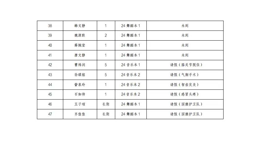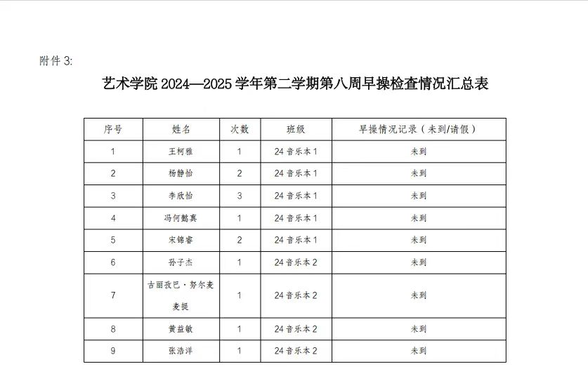 3. 早操出勤:大部分同学积极参与早操,精神状态佳;部分班级有早操缺勤问题,请假和未到人数偏多。